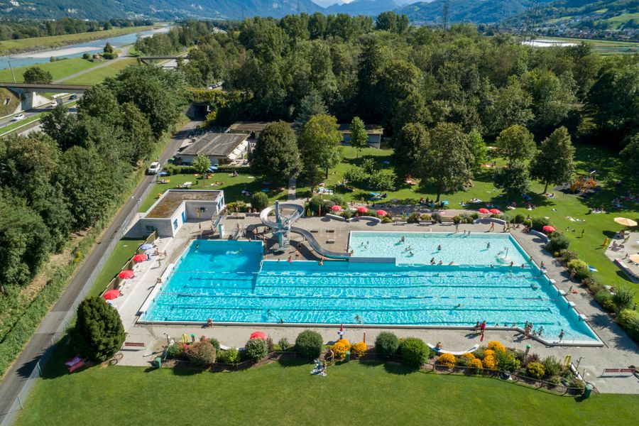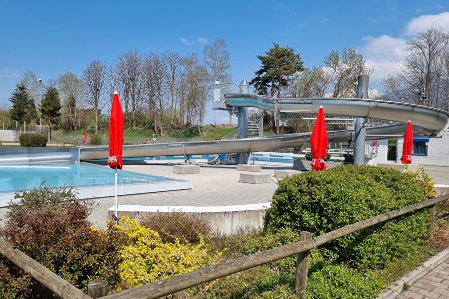 Sonniges Freibad mit 50m Bahn, 36m Rutsche, Sprungbrettern, 3 Kinderbecken und solarer Wassererwärmung bis 25°C.