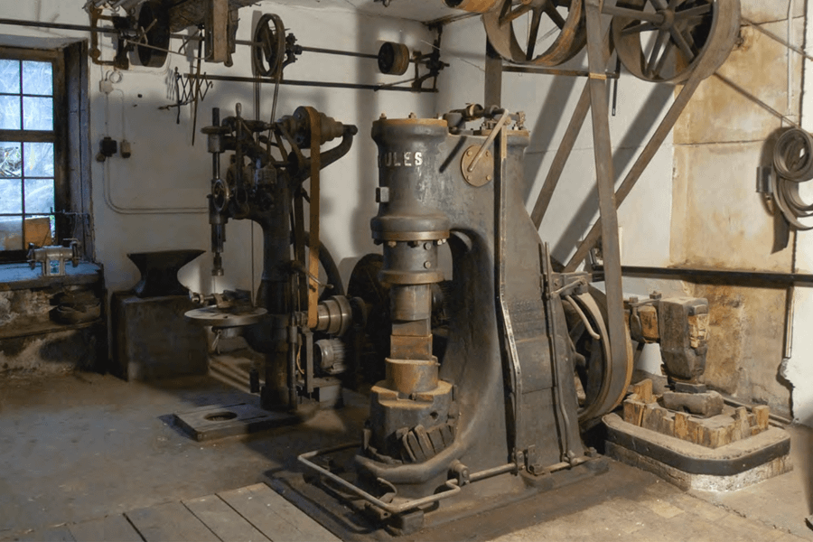 In diesem 1803 erbauten Haus waren schon zu Beginn eine einfache Schmiede sowie eine Gerberei untergebracht. Die mittels Wasserkraft betriebene Transmission und der grosse Hammer